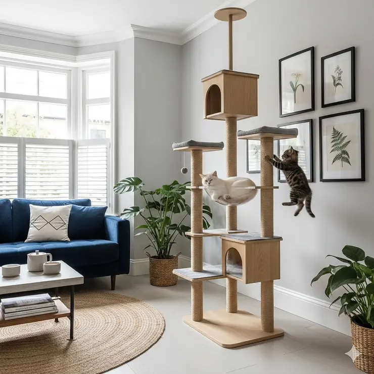 Measure twice, buy once! Account for both base dimensions and height (including any ceiling fixture requirements). Consider room layout changes – will you still want the cat tree there in six months? Models occupying prime living room real estate need to be aesthetically acceptable long-term.