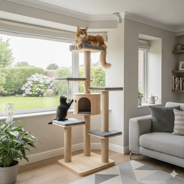 Multi-level towers maximise vertical space, particularly valuable in smaller British homes where floor area proves precious. Models exceeding 180cm provide extensive territory without consuming excessive room, though ceiling height restrictions apply.